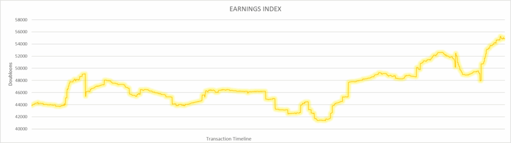 The FEGRAM Earnings Index started at $43,875.52 and ended at $54,862.34. This is up +25.04%. This index was hit hard by inflationary spending, followed by inflation correction during the 10th Anniversary event, and finally a near total collapse into recession during the Halloween Event.