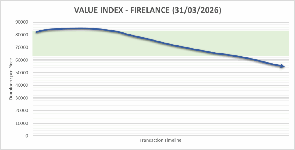 This month we recorded the fall of a previously stable item, the Firelance. These were one of the early iconic blunderblaster style weapons, and because they saw frequent re-additions to the game, they retained their six figure price point longer than other Inyolan weapons. Examples of what happens when an item is re-released is the February Blunderblaster from last year, and the Katana the year before that. This time is was the Firelance that saw the price drop.