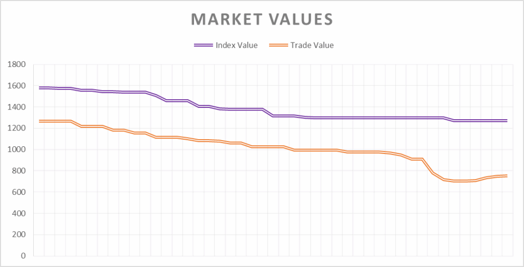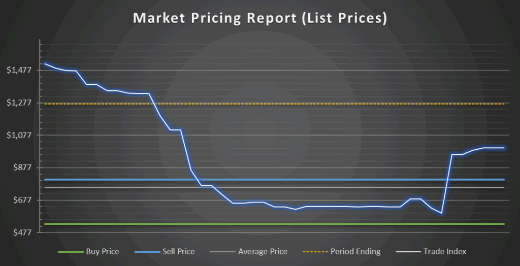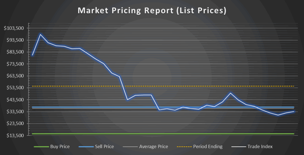 Looking at the Market Value Report, we see some alarming trends. First the Index Value, which is what the Price Guide uses, shows the trending average based on the assumption that people who previously listed the item, and didn’t sell it, would still sell it at that price, In other words its the current intrinsic value of the item. This is seeing a steady decline, with no upward movement, ending down -24.4% for the month.