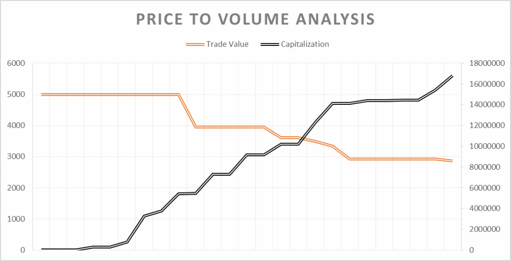 The second line is the Trade Value which works similar to a futures index. This is usually a sign of where the market is going with the item, and in this case it means, while the intrinsic value says $1.2k, the real amount of money you can realistically get for this right now is only $800 doubloons. When reading a chart like this, it’s an indication that the market is saying this has further to fall, and I project we won’t see these two lines converge (meaning they have hit their true price point) until the Index Value hits $1k per piece.